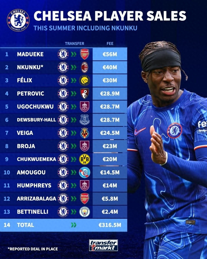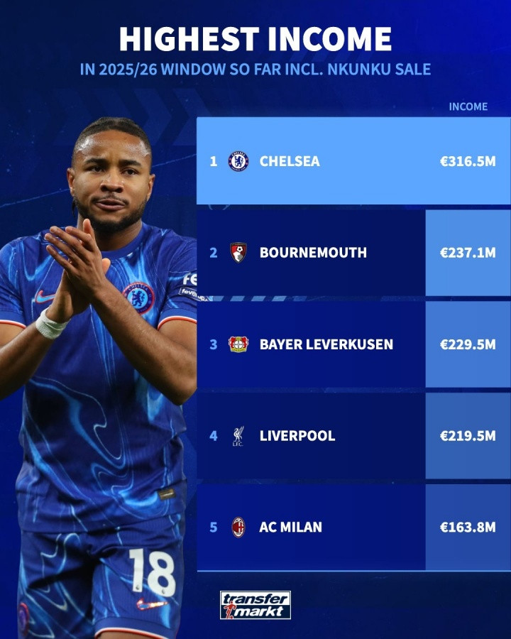 直播吧08月28日讯 据多家媒体消息,恩昆库即将以超过4000万欧元转会费加盟米兰,据德转统计,切尔西今夏卖人总收入将达到3.165亿欧元,冠绝全欧,比卖人榜第二位的伯恩茅斯多了近8000万欧元。